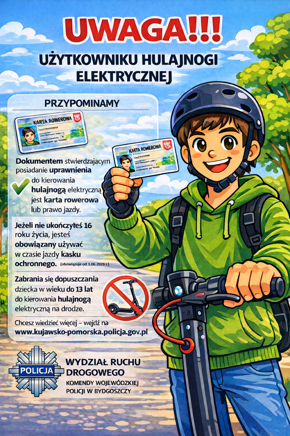 13 lat to minimalny wiek do kierowania hulajnogą elektryczną lub urządzeniem transportu osobistego na drodze! Zmiana ta weszła w życie 3 marca i jest odpowiedzią na rosnącą liczbę zdarzeń drogowych z udziałem użytkowników tego typu pojazdów. Apelujemy do rodziców i opiekunów, aby zwracali uwagę na swoje pociechy! Wspólna odpowiedzialność i przestrzeganie przepisów to klucz do poprawy bezpieczeństwa na drogach.