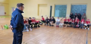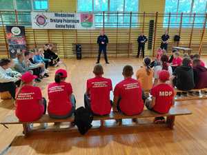 Policjanci wąbrzeskiej "drogówki" wspólnie z oficerem prasowym przeprowadzili pogadankę z dziećmi, młodzieżą oraz ich opiekunami z terenu gminy Ryńsk, którzy są członkami lokalnych OSP i MDP.