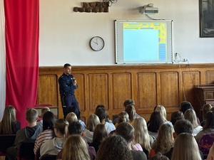 Policjanci podczas prelekcji uświadamiają uczniów, że każde dziecko ma prawo dorastać w świecie bez hejtu