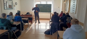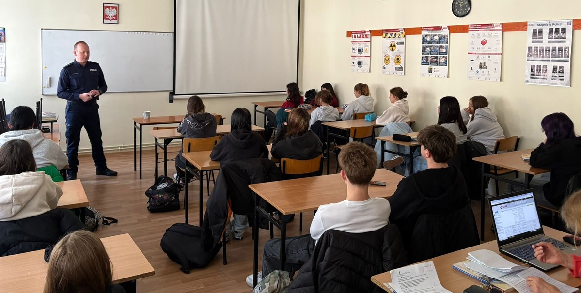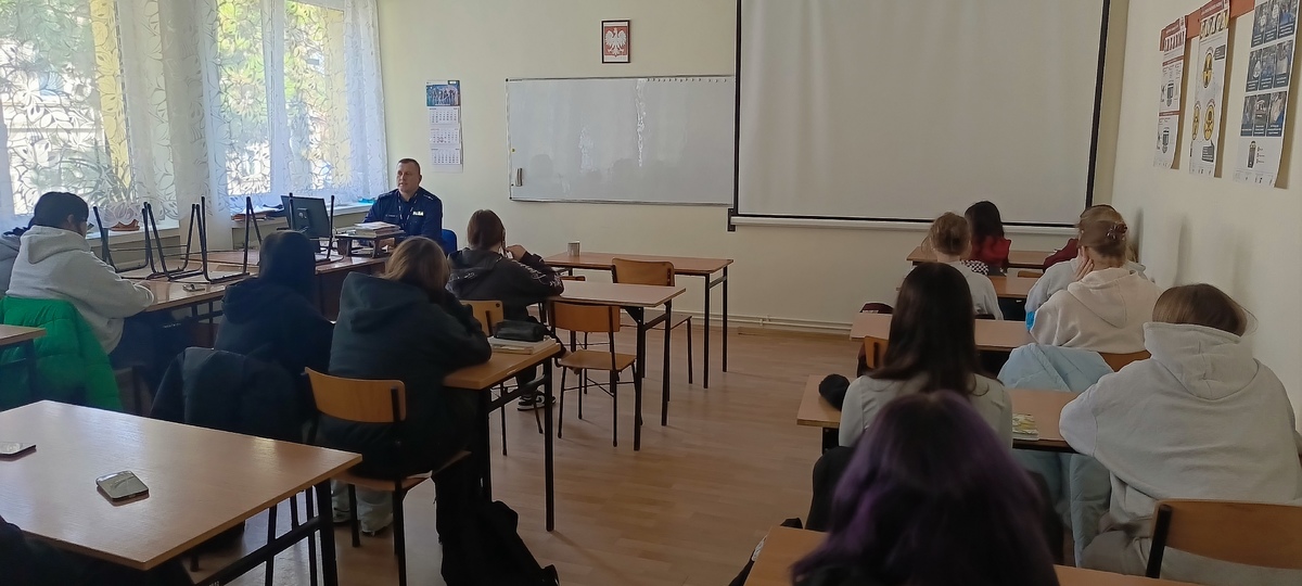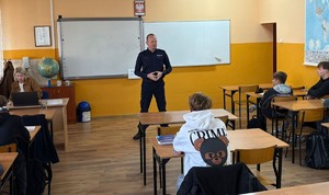 Policjanci zajmujący się profilaktyką społeczną, starszy aspirant Krzysztof Świerczyński oraz młodszy aspirant Marcin Strzelecki odwiedzili uczniów klas pierwszych Zespołu Szkół w Wąbrzeźnie. Zgodnie z wieloletnią już praktyką, nasi funkcjonariusze przeprowadzają indywidualne, kameralne spotkania z każdą klasą, aby zapewnić jak najlepszy przepływ informacji i swobodę wypowiedzi.